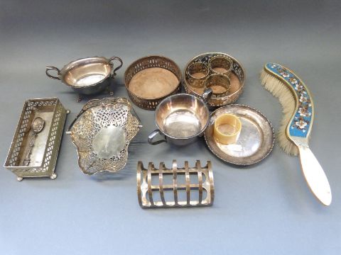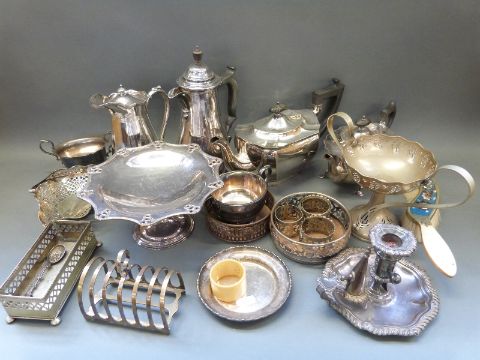 A quantity of silver plate including teaware, Art Nouveau tazza, serving dishes, swagger stick etc