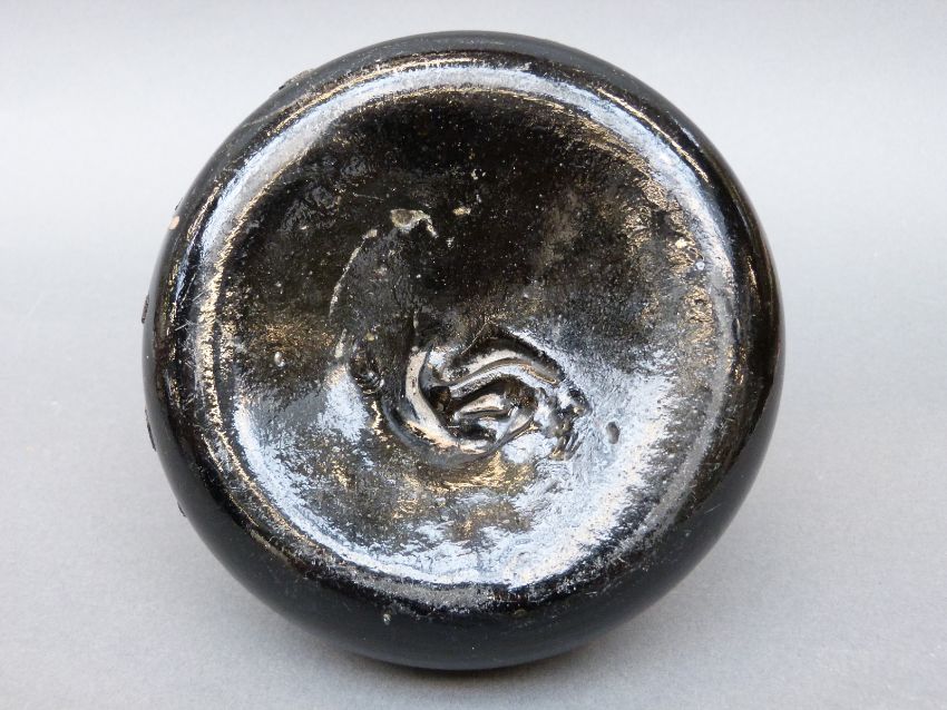 An 18thC green glass wine bottle of squat form, 15cm in diameter