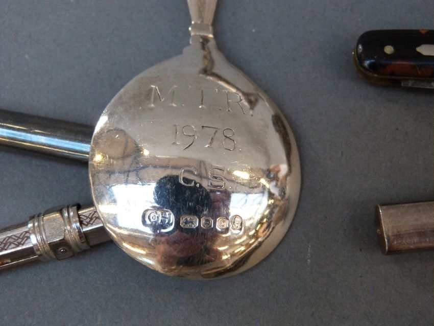 A pair of Edward VII hallmarked silver knife rests, B'ham 1902, maker Arthur Cook, Guild of Handicrafts, or George Henry Hart, a hallmarked silver caddy spoon, Ldn 1977 and various hallmaked silver, white metal and other pencils, holders etc