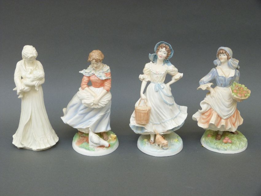Four Royal Worcester figurines including three from the Old Country Ways Series Milkmaid, Rosie Picking Apples, Farmer's Wife and another Sweet Dreams