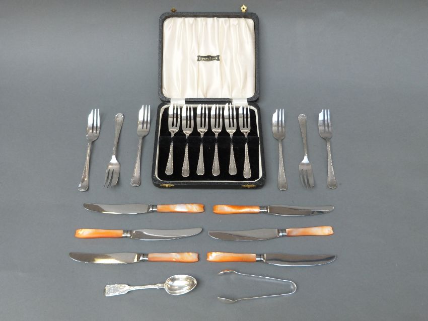 A cased set of George VI hallmarked silver cake forks, Sheffield 1939 together with a silver teaspoon and sugar tongs, weight of all 133g, a set of six knives with collars marked sterling silver, and a set of six plated cake forks