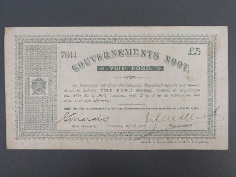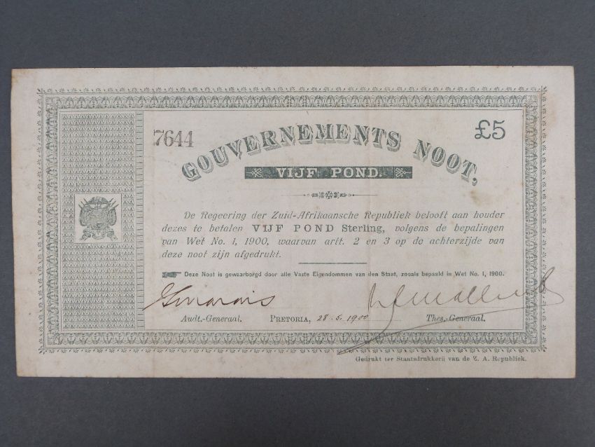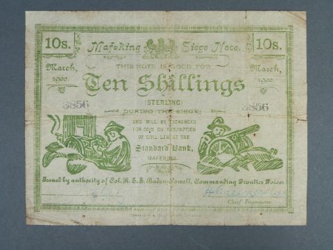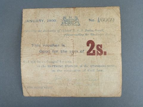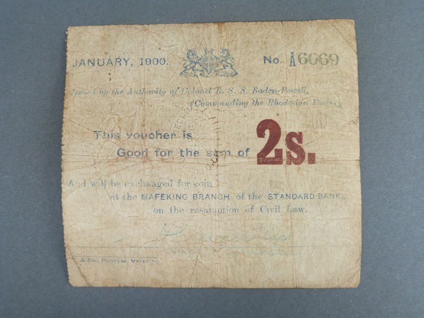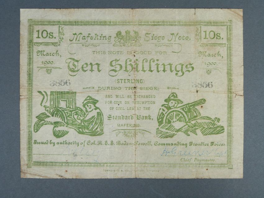 Mafeking Siege notes 1900 Boer War issued by Col Baden Powell, to include S652 two shillings No. A6069, S654 ten shillings No. 3856, together with Anglo Boer War P.55, five pounds note No. 7644 F-GF