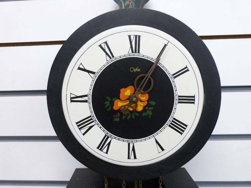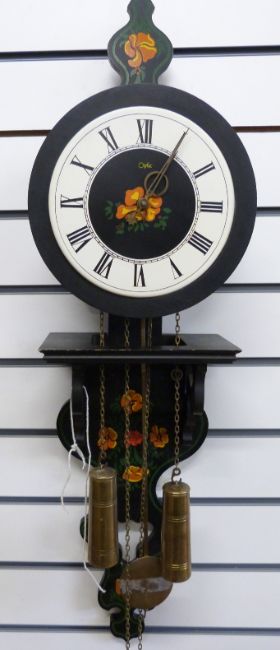 A Dutch wall clock by Orfac in floral painted case, with weight driven two train movement striking on a bell, contrasting Roman chapter ring and brass moon and star hands