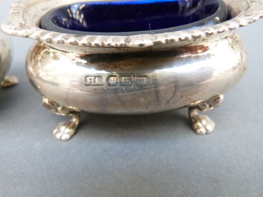 A pair of Edward VII hallmarked silver open salts with graduated edge, raised on four claw feet and with blue glass liners, Sheffield 1904, maker Atkin Brothers, length 7cm, weight of silver 106g