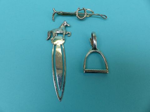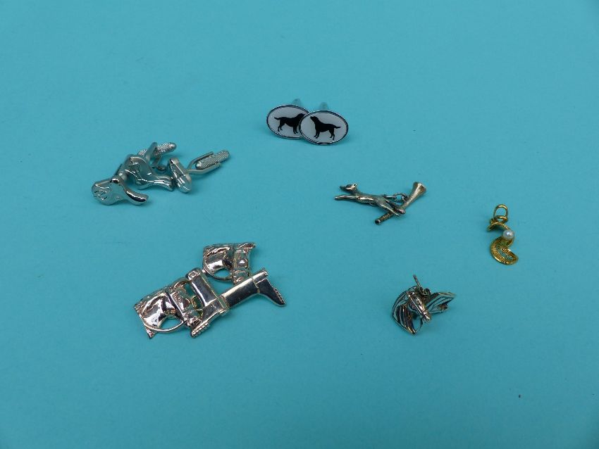 A collection of silver jewellery largely horse or riding related to include enamel horse, bookmark, cufflinks, riding crop tie clip, stirrup pendant, horse and riding boot cufflinks etc