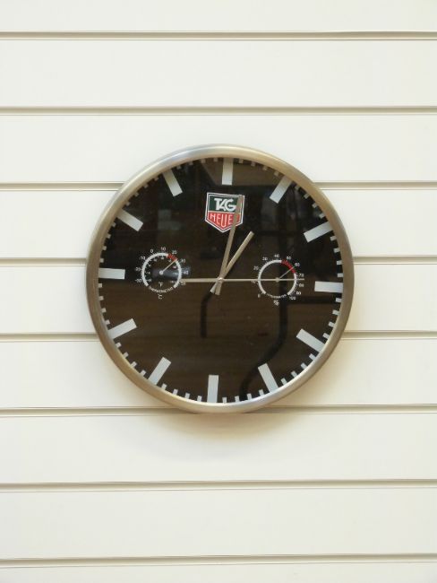 Tag Heuer advertising wall clock with thermometer and hygrometer to dial, black face and aluminium case, 35cm in diameter.