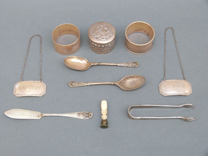 A pair of claret and brandy hallmarked silver bottle tickets or labels, Sheffield 1935 and 1936, two hallmarked silver napkin rings and various silver spoons etc and an Eastern white metal trinket pot and a small intaglio seal, weight of silver and white metal 145g
