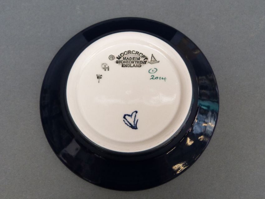 A Moorcroft pin tray decorated with Santa, reindeers and sleigh flying over the Potteries, dated 2014, 12cm diameter