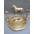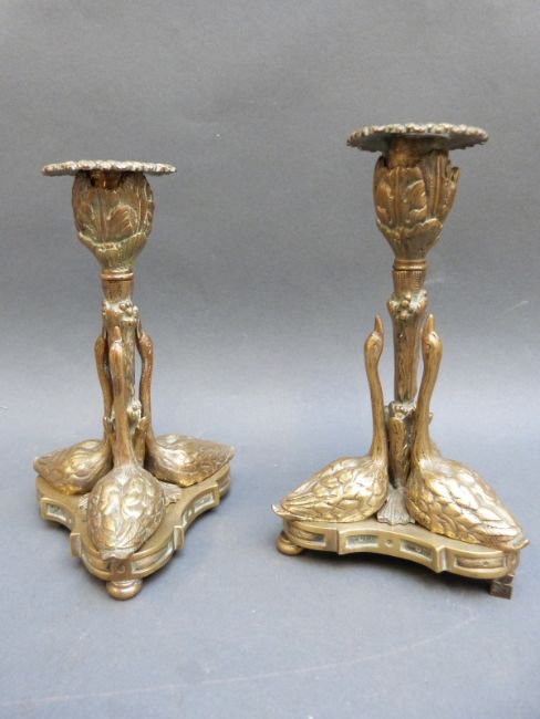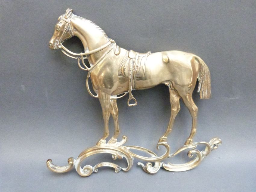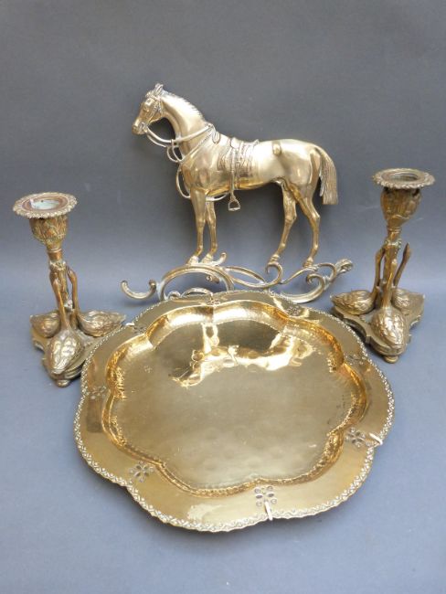 A 19thC / early 20thC brass horse plaque, length 28cm, a pair of swan candlesticks and a Arts and Crafts brass dish