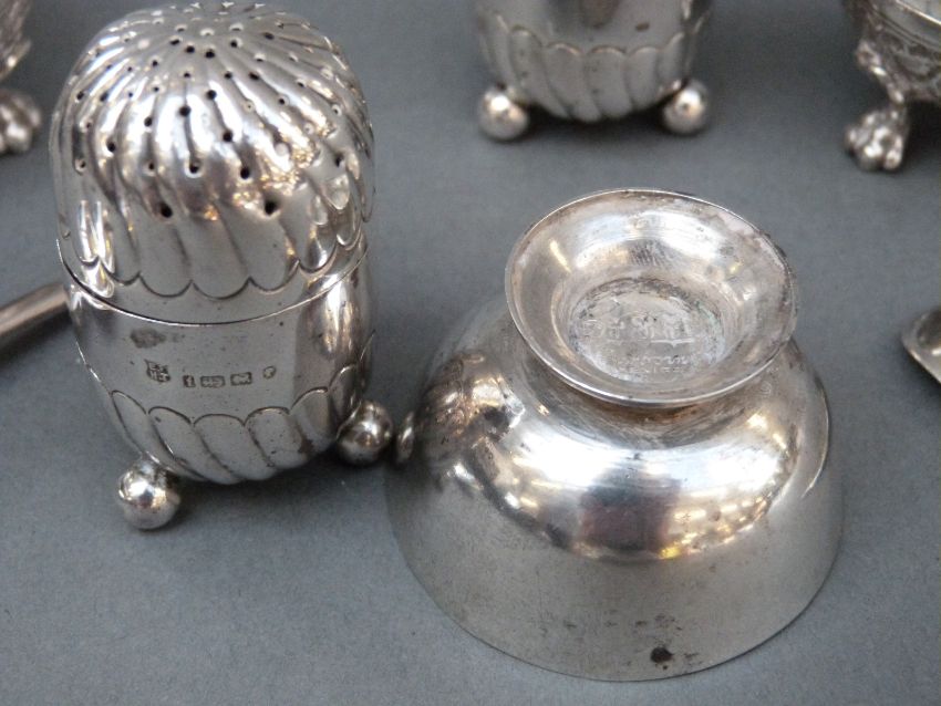 A pair of Victorian hallmarked silver wrythen peppers, B'ham 1880, a hallmarked silver spoon and a pair of Italian / Eastern white metal salts, weight of silver and white metal 137g, together with a small salt marked Mexico