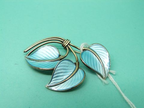 A silver brooch in the form of three leaves set with blue enamel and marked Norway
