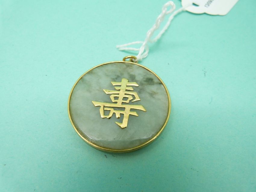 A Chinese yellow metal pendant set with a jadeite section and Chinese characters to the centre