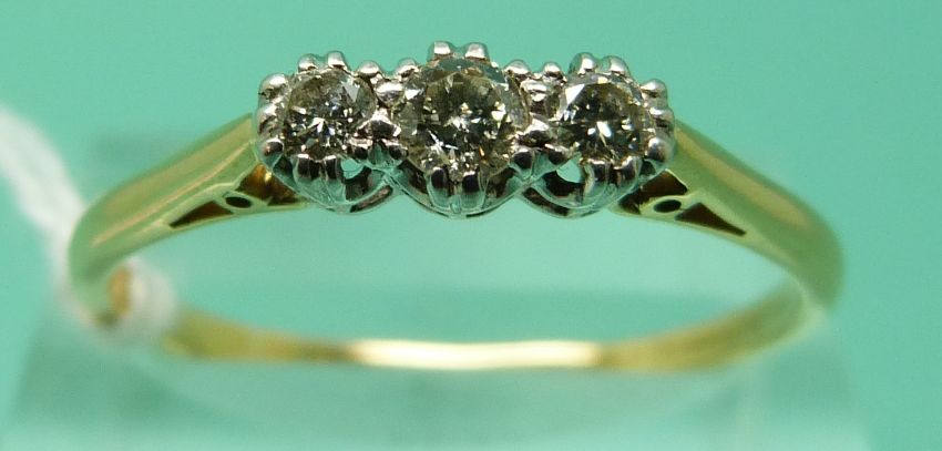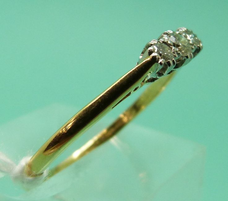 An 18ct gold ring set with three diamonds in a platinum setting (size V), weight 2.68g