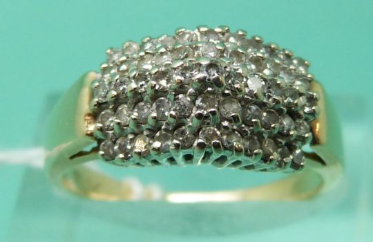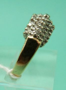 A yellow metal ring marked 14k set with diamonds in a raised cluster (size N)