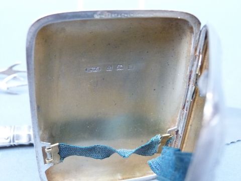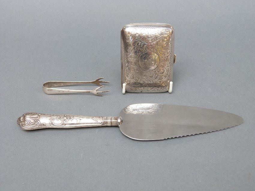 A hallmarked silver cigarette case and sugar nips, weight 67g, and a hallmarked silver-handled cake slice