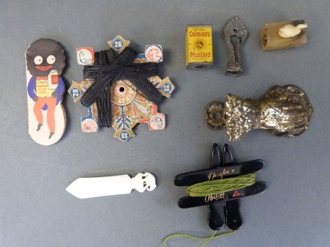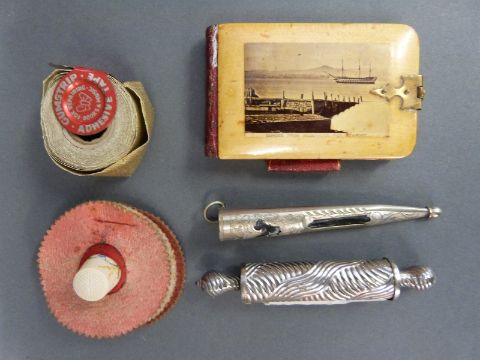 A quantity of sewing and other collectables including Mauchline ware notebook