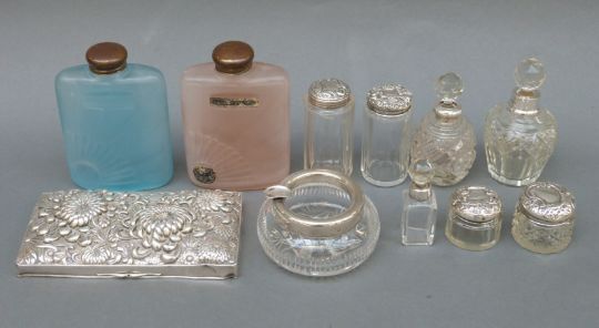 A quantity of hallmarked silver-mounted cut glass dressing table bottles, plated embossed box top, two Art Deco style scent bottles etc