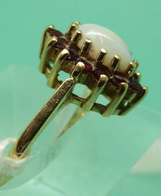 A 9ct gold ring set with an opal cabochon surrounded by garnets (size H)