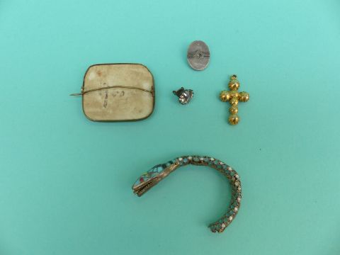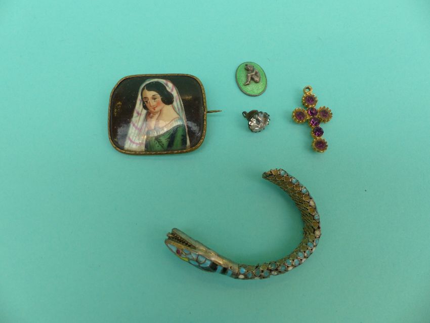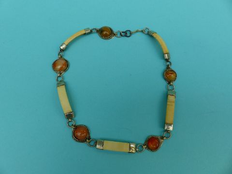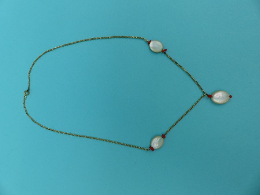 An ivory and agate necklace, coral and pearl necklace, painted brooch, other costume jewellery etc