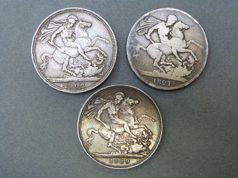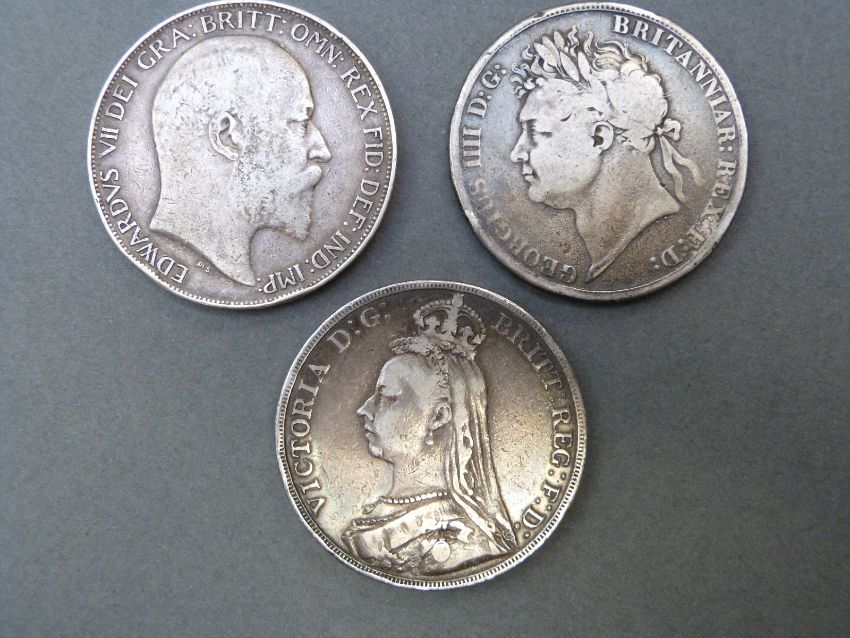 An 1821 George IIII crown together with an 1889 Victoria jubilee crown and a 1902 Edward VIII crown