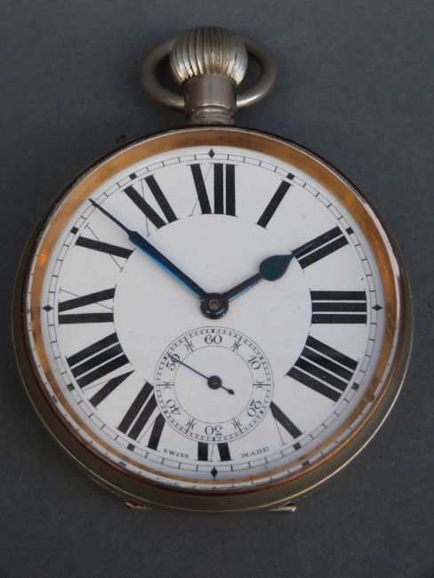 Swiss Goliath style keyless winding open faced pocket watch with Roman numerals, subsidiary seconds dial and blued hands, case diameter 66mm, in hallmarked silver case, Birmingham, 1921, William Neale & Son Ltd.