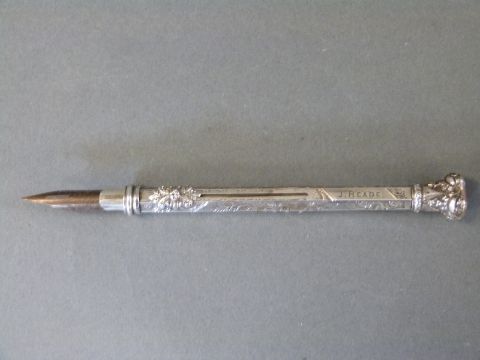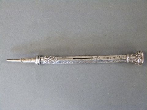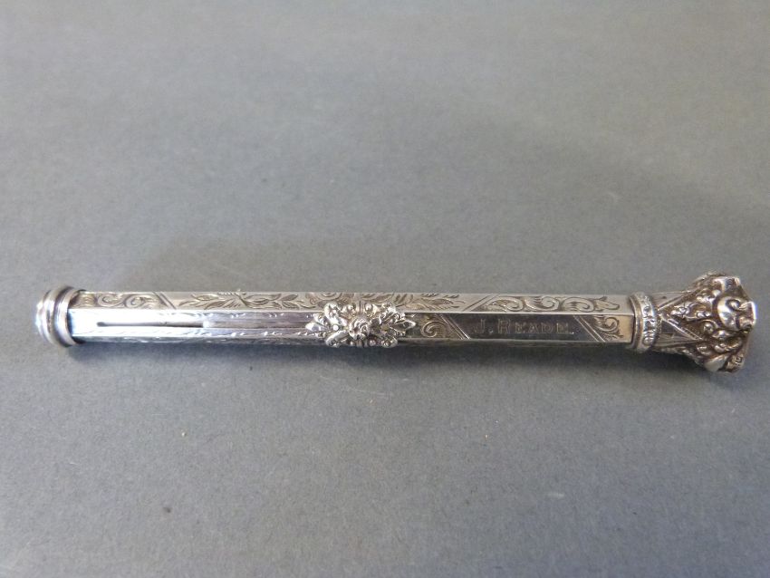 A Victorian hallmarked silver agate topped retractable pencil and pen, Birmingham possibly 1886, length retracted 9.5cm