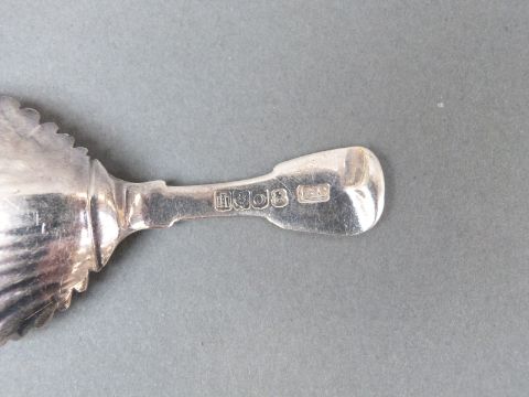 A Georgian Scottish fiddle pattern hallmarked silver caddy spoon with shell bowl, Edinburgh 1820, length 9.5cm, weight 12g
