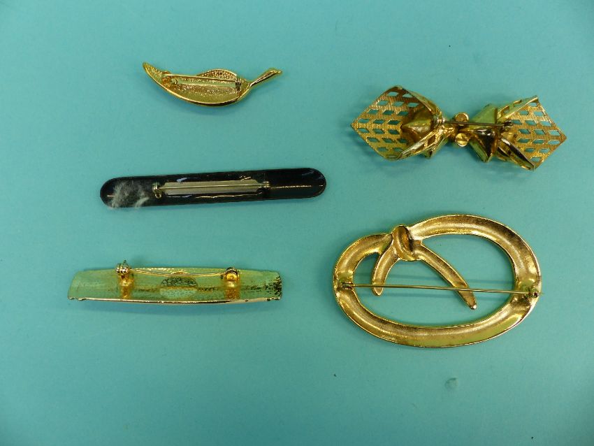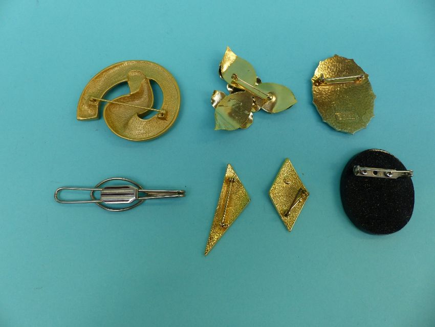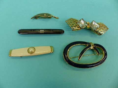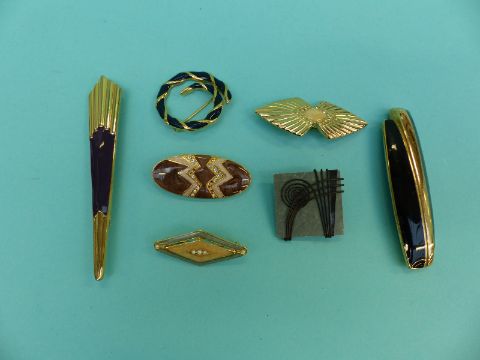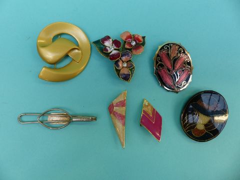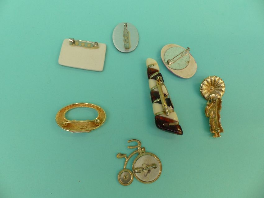 A collection of brooches including enamel, one in the form of a geisha girl, a Stratton tie clip, enamel by fish, Monet, Christian Dior etc