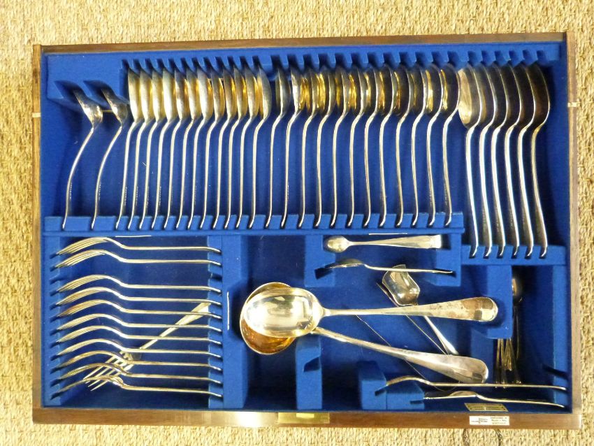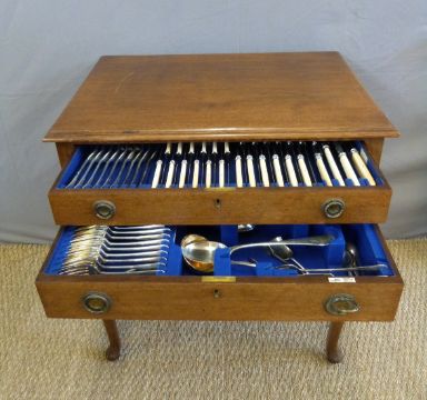 Walker & Hall twelve place setting canteen of cutlery in mahogany two drawer table