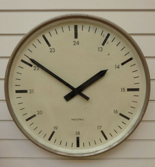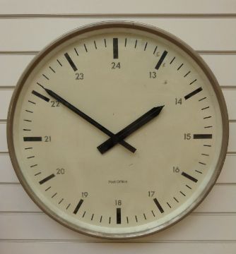 A large c1980s Post Office dial wall clock with baton numerals and Arabic 24 hour & baton hands on ivory coloured dial, the slave movement by Chloride Gent and marked 630837 100A 0 AA 80/MKI to back, steel case, diameter 60cm