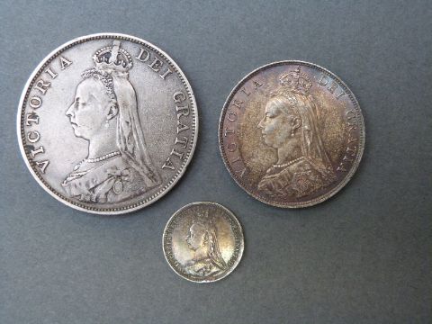 A Victoria double florin together with a florin and a threepence coin, all jubilee head