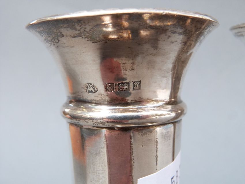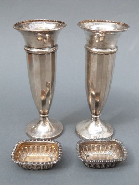 A pair of hallmarked silver posy vases, B'ham 1955, height 13.5cm, together with a pair of Victorian hallmarked silver salts, B'ham 1899, weight 157g