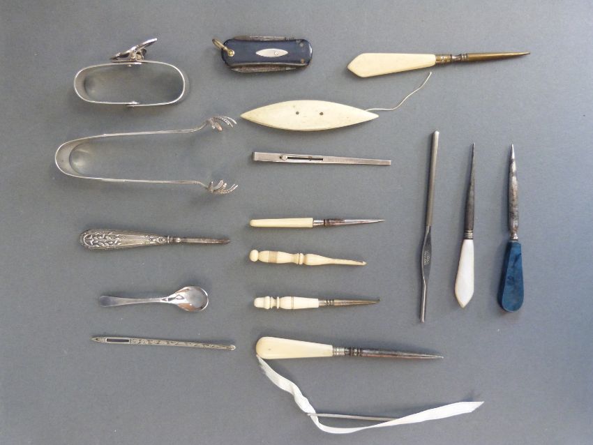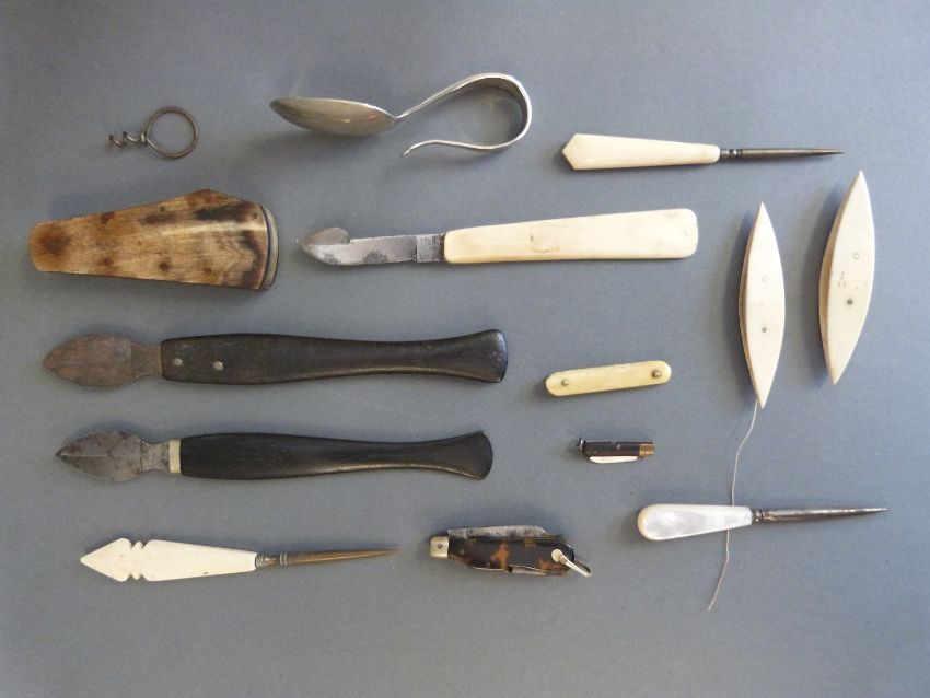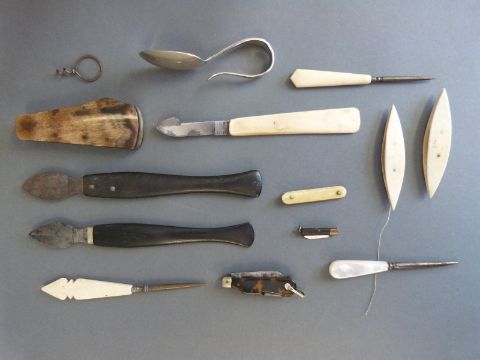 A quantity of small folding knives, bone/ivory handled items, fleames etc