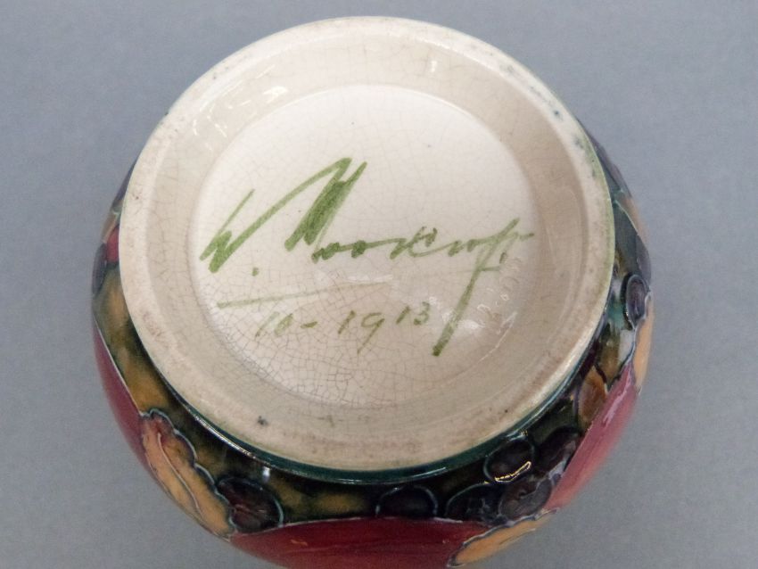An early Moorcroft vase in Pomegranate pattern on a green ground, signed and dated 1913 to base, 9cm tall