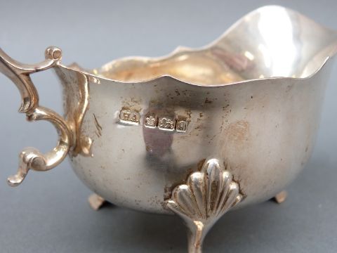 A Edward VII hallmarked silver sauce or gravy boat with scroll handle raised on three feet, Sheffield 1908, maker Atkin Brothers, length 16cm, weight 194g