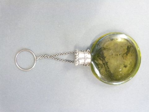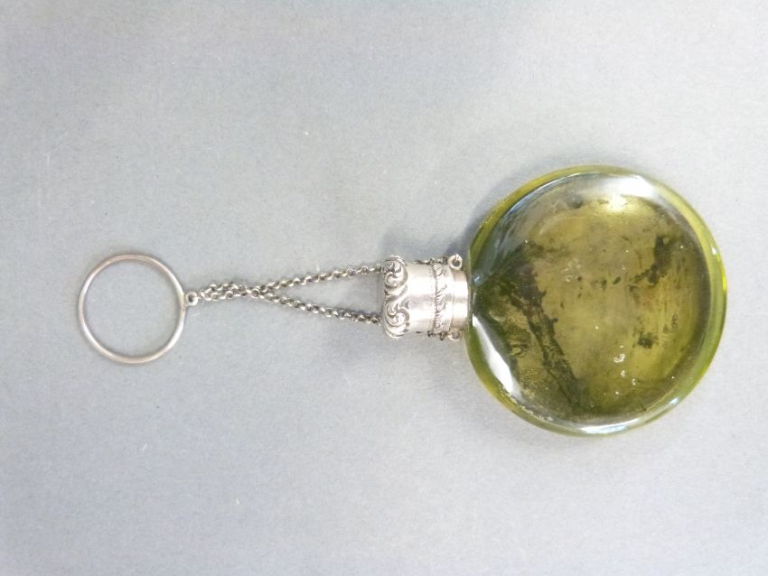 A circular painted glass, white metal lidded scent bottle marked Cooper Patent London
