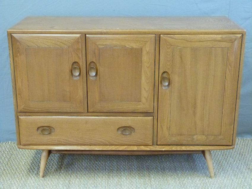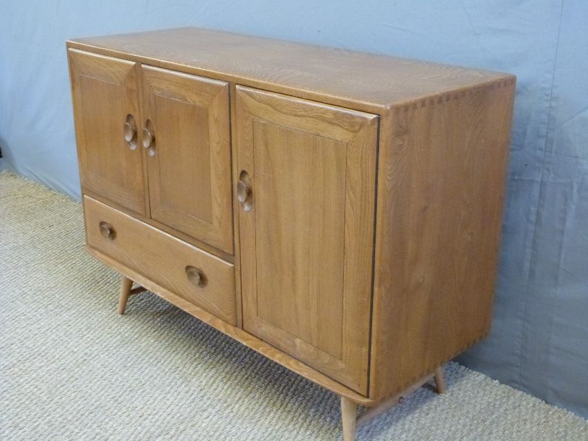 An Ercol light elm sideboard with double cupboard above a drawer and cupboard to side (W115 x D45 x H82cm)