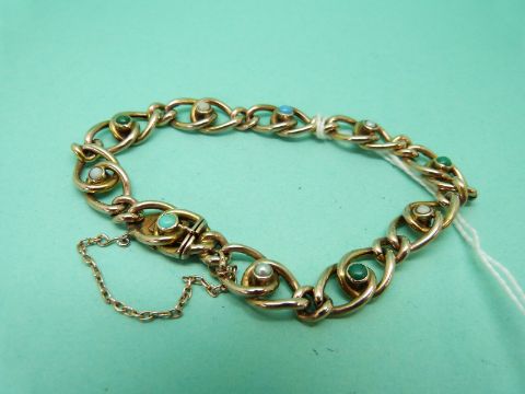 An Edwardian 9ct gold bracelet with knot design set with seed pearls and turquoise (11.6g)