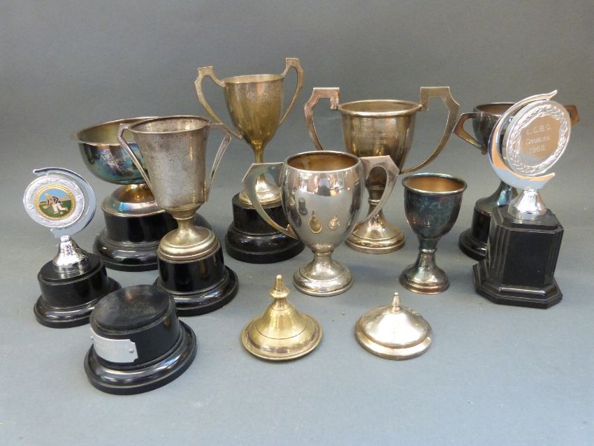 A quantity of trophies, trophy bases and awards including bowls and table tennis