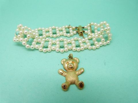 A 9ct gold teddy bear pendant and a pearl and turquoise bracelet with 9ct gold clasp