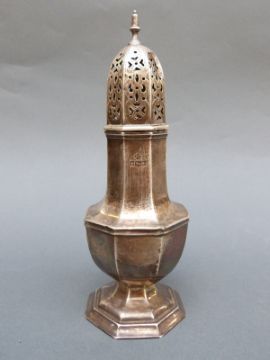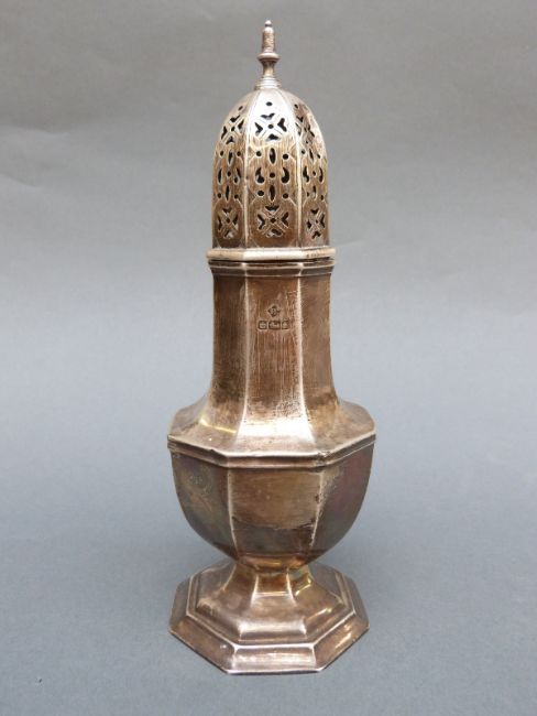An Edward VII hallmarked silver octagonal sugar caster, Sheffield 1903, maker Martin, Hall & Co., height 20.5cm, weight 173g