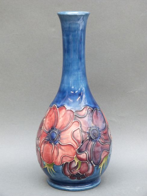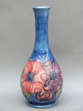 A Moorcroft pedestal vase in Anemone pattern on a blue ground, limited edition of 33/200, 27cm tall