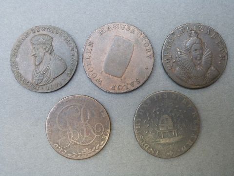 Five 18thC Conder type tokens to include Chichester halfpenny, Shrewsbury halfpenny, Welsh example etc