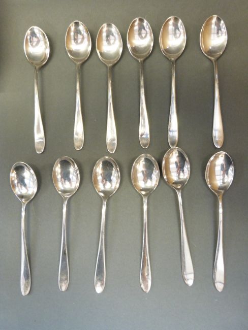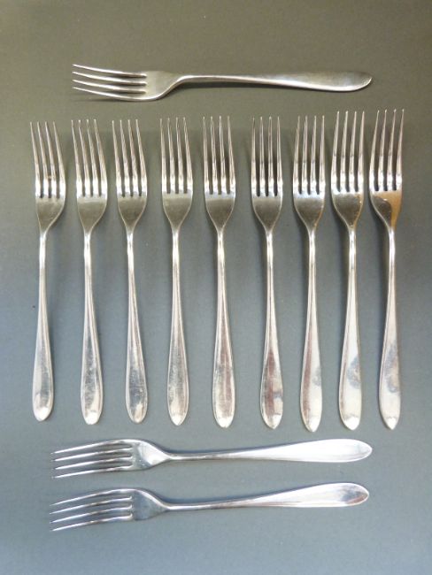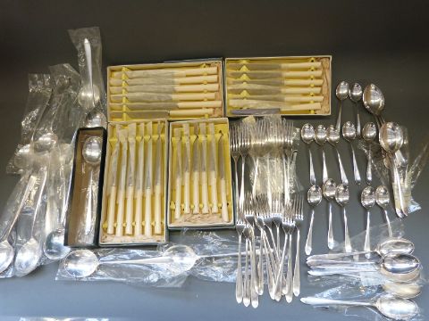 A boxed 12-place service of David Mellor Pride pattern silver plated cutlery by Walker & Hall comprising forks, dessert forks, tea spoons, soup spoons, dessert spoons, dinner knives and cake knives