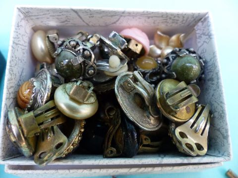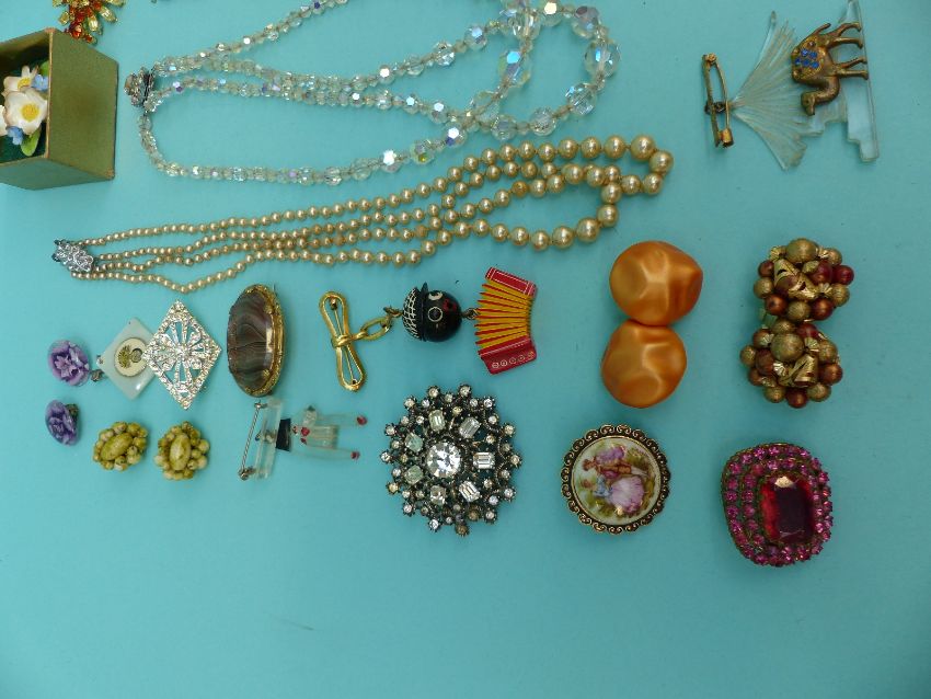 A collection of costume jewellery including lucite brooch, micro mosaic earrings, agate brooch etc