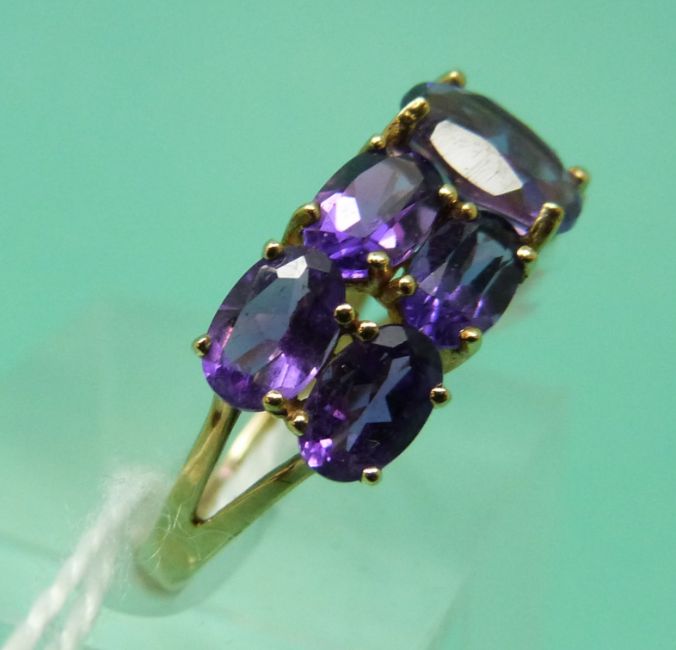 A 9ct gold ring set with oval amethysts (size L)