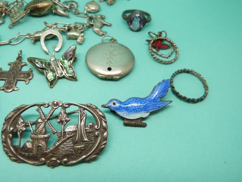 A collection of silver jewellery to include an enamel brooch, silver brooches, silver charm bracelet etc