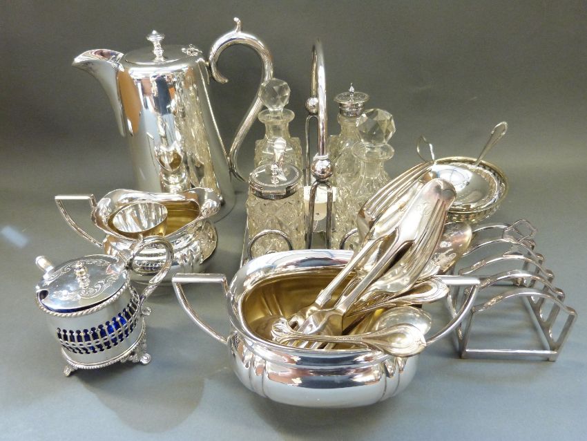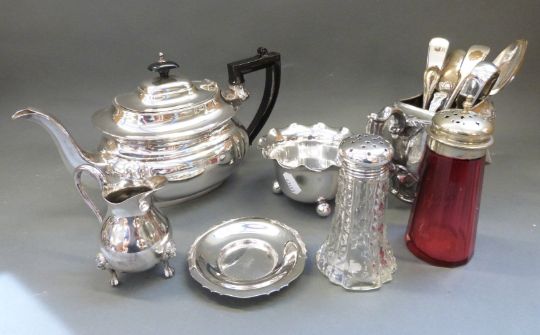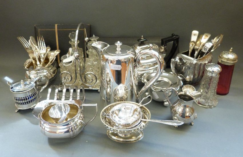 A quantity of silver plated ware to include four-bottle cruet, teaset, silver-topped sugar caster, cased cutlery including hallmarked silver handled etc