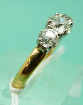 A 22ct gold ring set with an old English cut diamond measuring approximately 1ct flanked by two old English cut diamonds each approximately 0.5ct (size O)