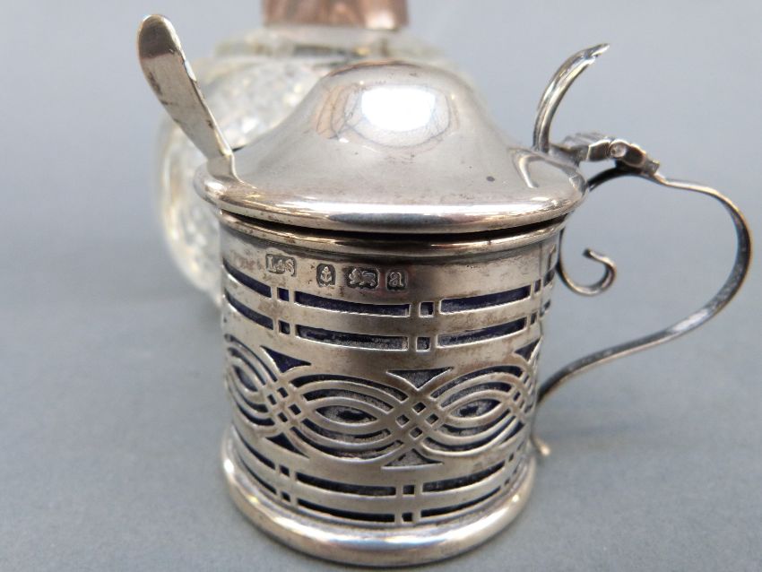 A hallmarked silver mustard pot and spoon and a hallmarked silver-mounted Mappin Brothers glass bottle
